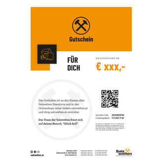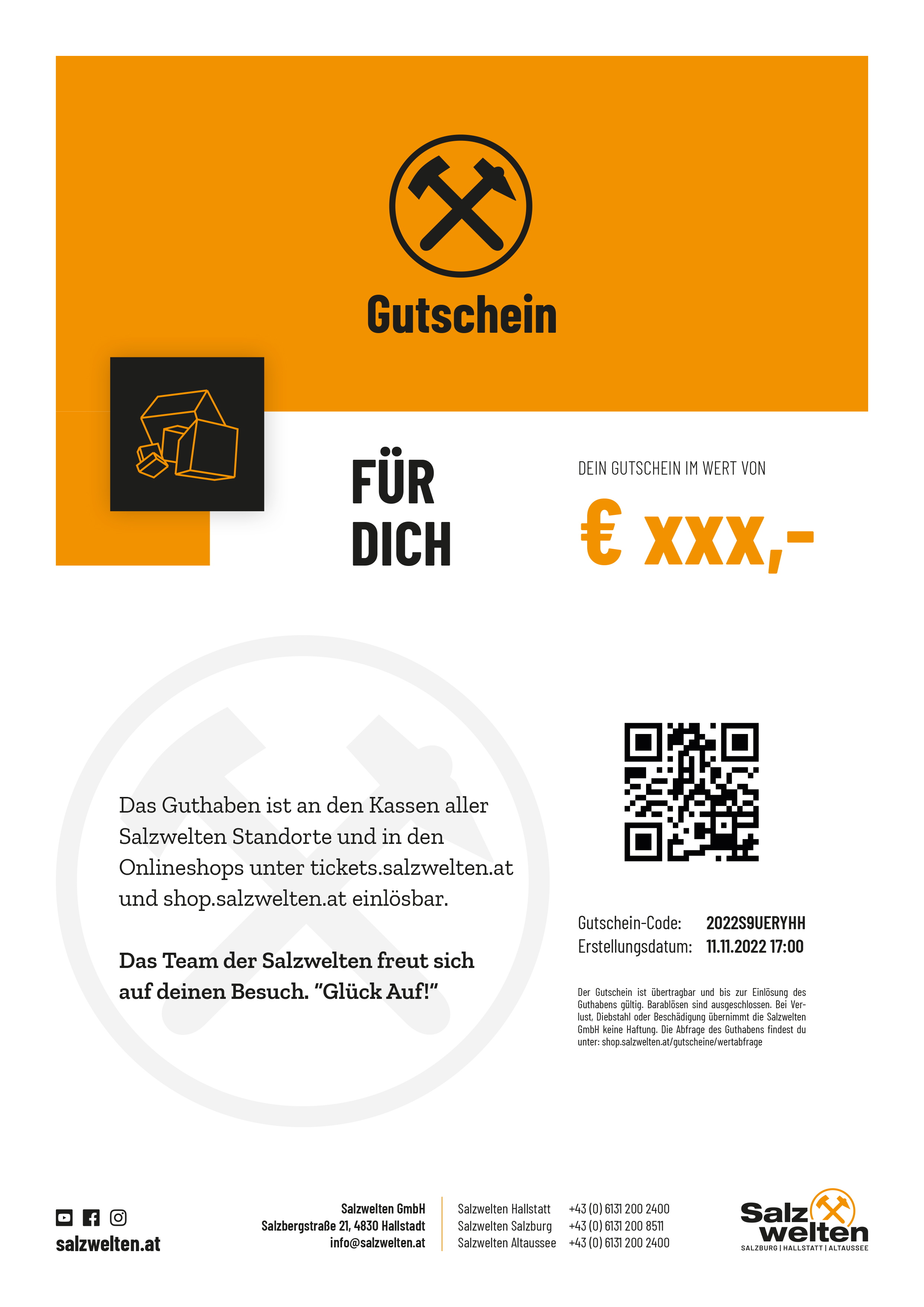 An den folgenden Stellen können die Wertgutschein eingelöst werden: An den Kassen aller Salzwelten Standorte und in den Onlineshops unter tickets.salzwelten.at und shop.salzwelten.at. Das Gesamtguthaben kann dabei an mehreren Stellen genutzt werden. So kann der Gutschein – das entsprechende Guthaben vorausgesetzt – beispielsweise für den Eintritt und anschließenden im Salzwelten Shop verwendet werden. Vor Ort wird der Wert des Gutscheins um den jeweiligen Wert der gewählten Produkte und Leistungen vermindert. Das verbleibende Guthaben kann man dann bei einem späteren Besuch nutzen. Eine Barablöse ist nicht möglich.