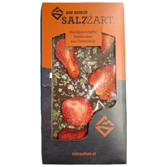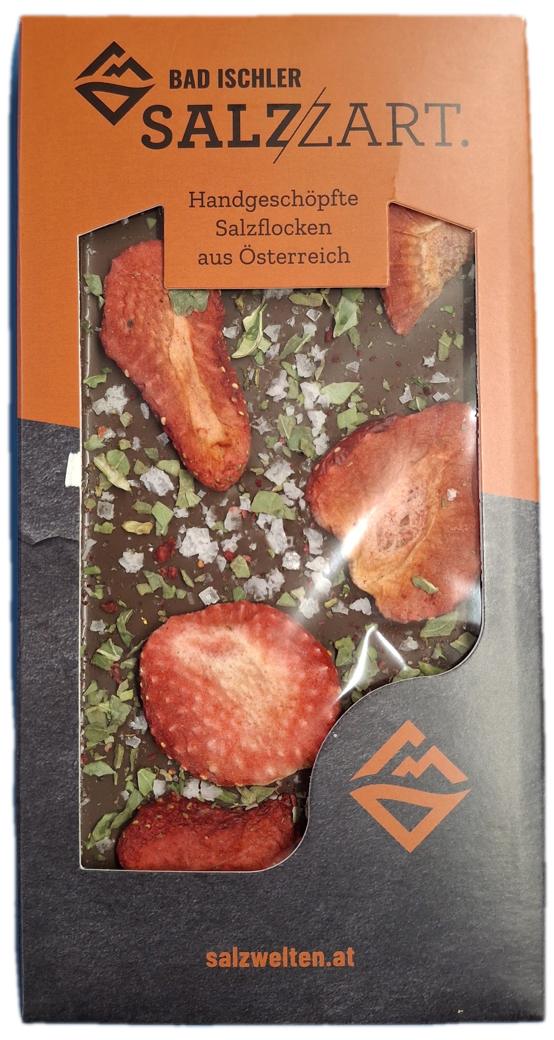 Milchschokolade (Zucker, Kakaobutter, Vollmilchpulver, Kakaomasse, Emulgator, Sojalecitrin, Bourbon Vanile), Salzzart, gefriergetrock Erdbeeren 3,5%, gefriergetrock. Basilikum 0,9%, Salzzart 0,03%, Kakaomasseanteil mindestens 33,6%
